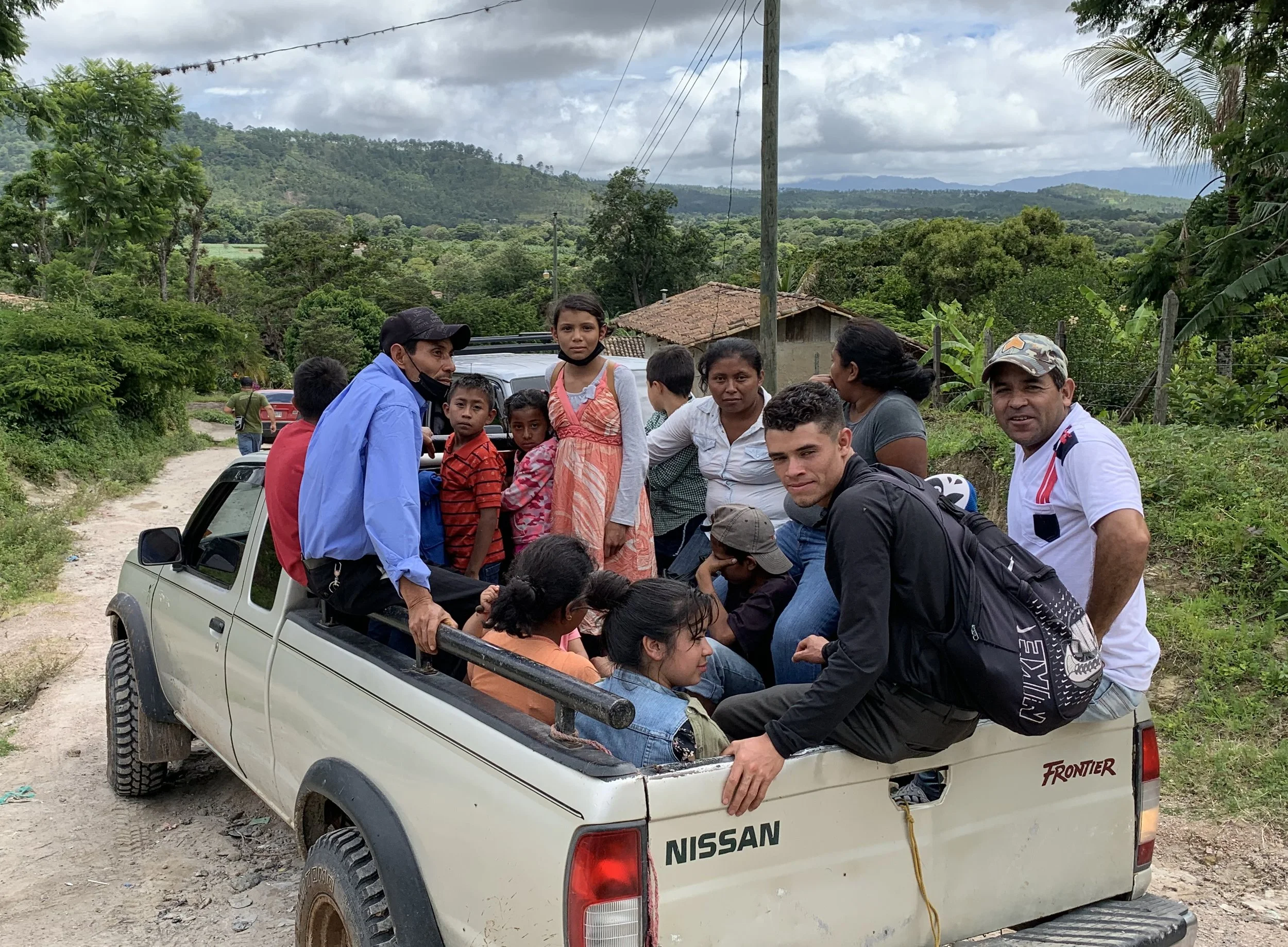 Doubling as a church bus, the sturdy truck carries villagers to their newly constructed church in Guinope for the dedication service.
