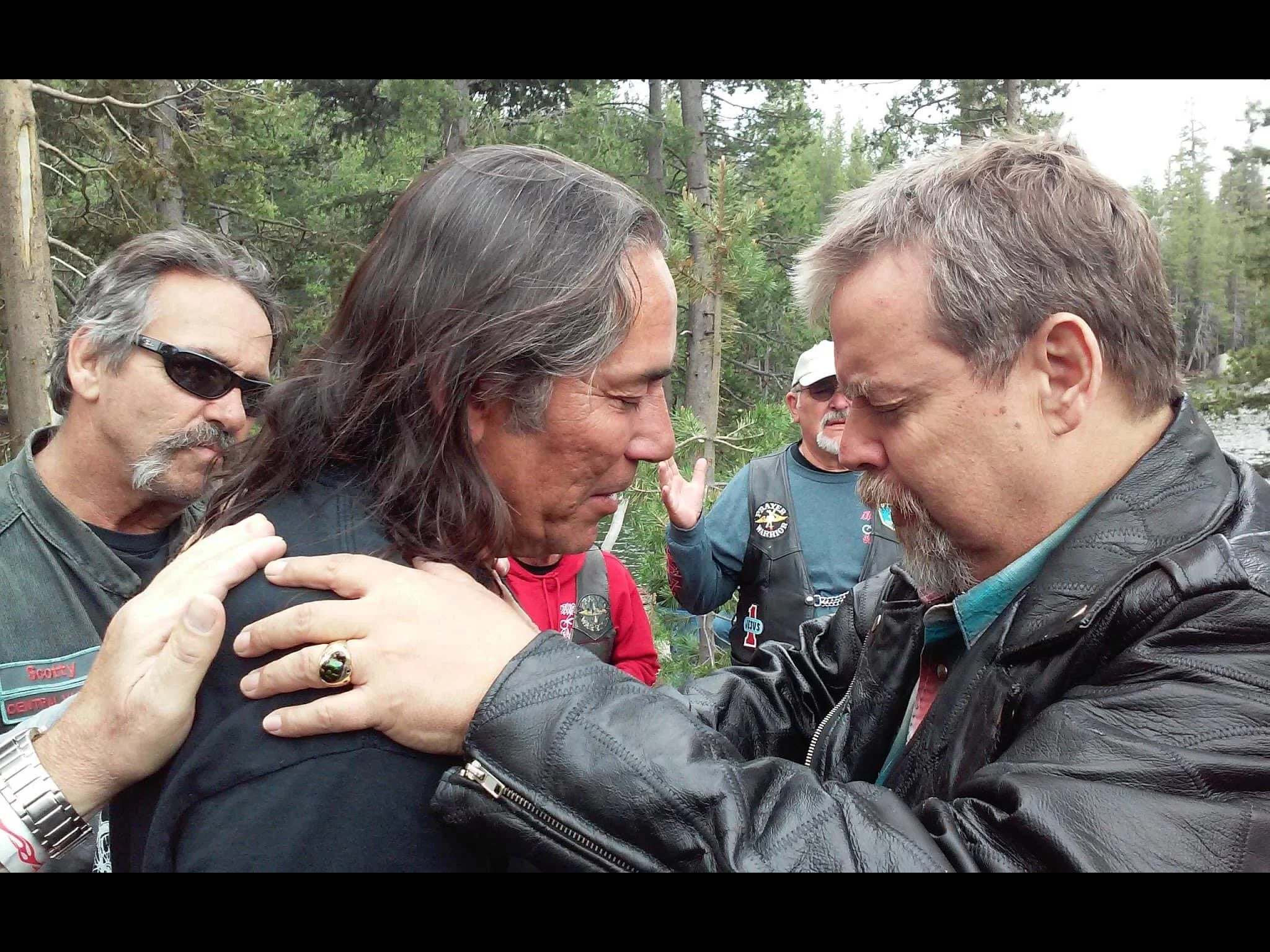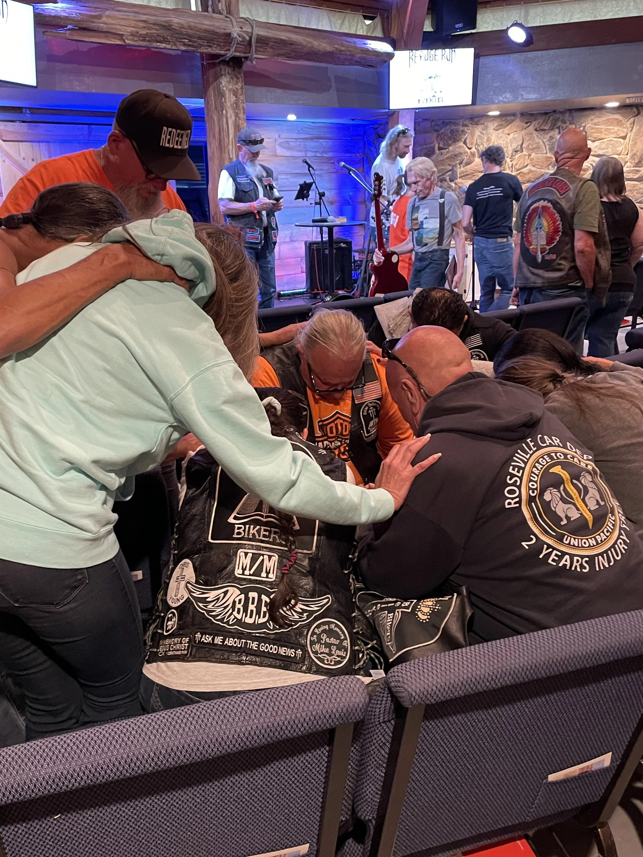 James “Indian” Parish (left), who went to be with the Lord this year, prays with Paul Coca. Connie McCamey, wife of Pastor Shawn, reflected, “Over the years we have seen many people give their lives to the Lord and get baptized. We have spent hours listening to the stories the bikers share of redemption and renewal.”