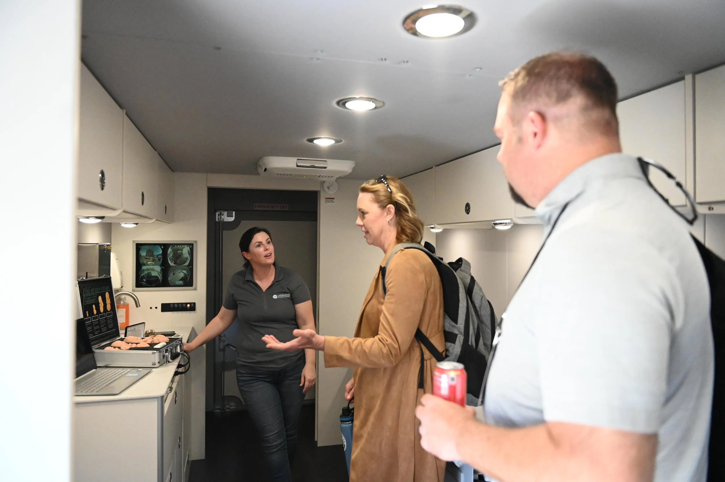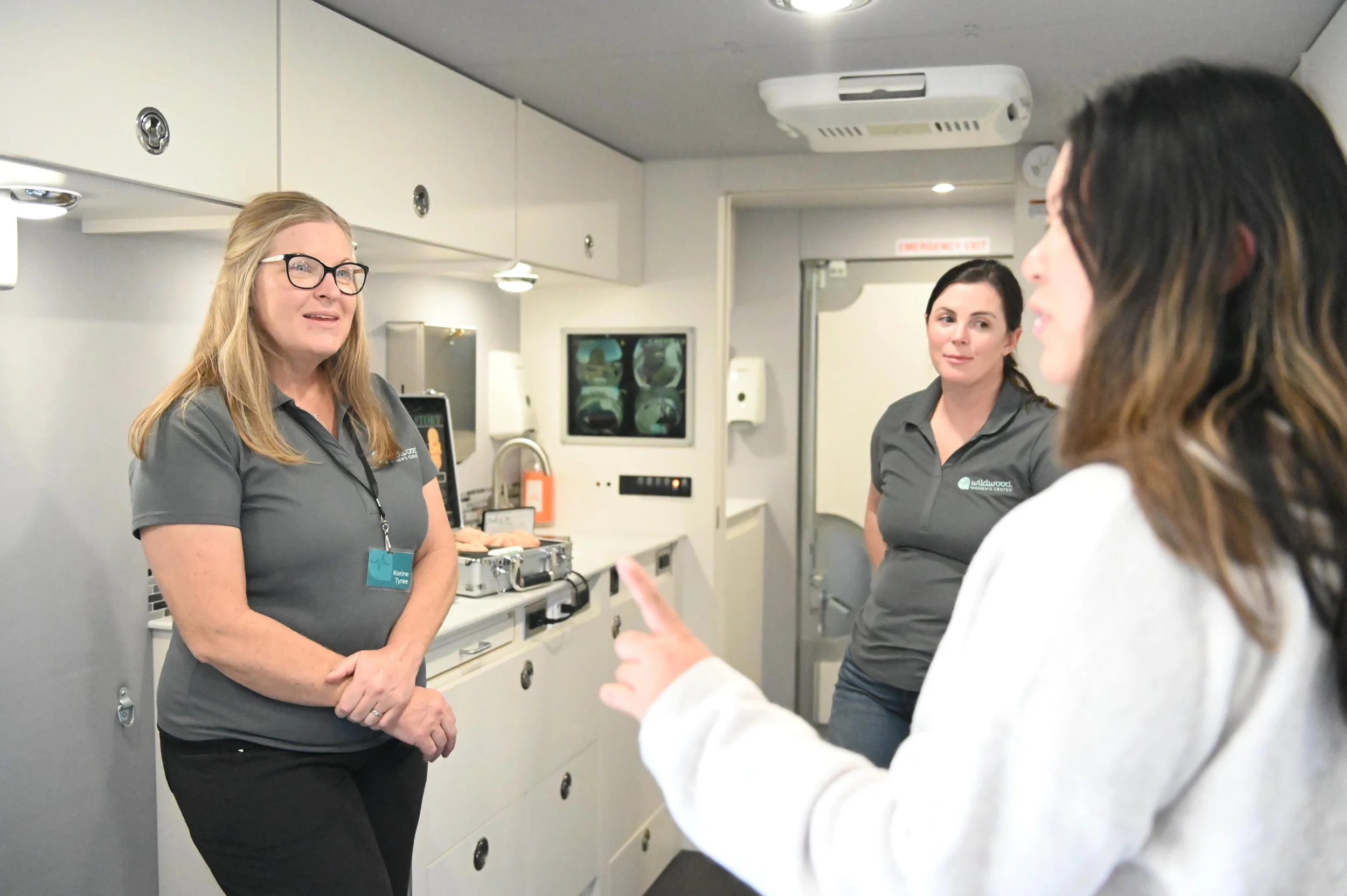 Grace’s staff talk with a visitor inside the mobile medical unit.
