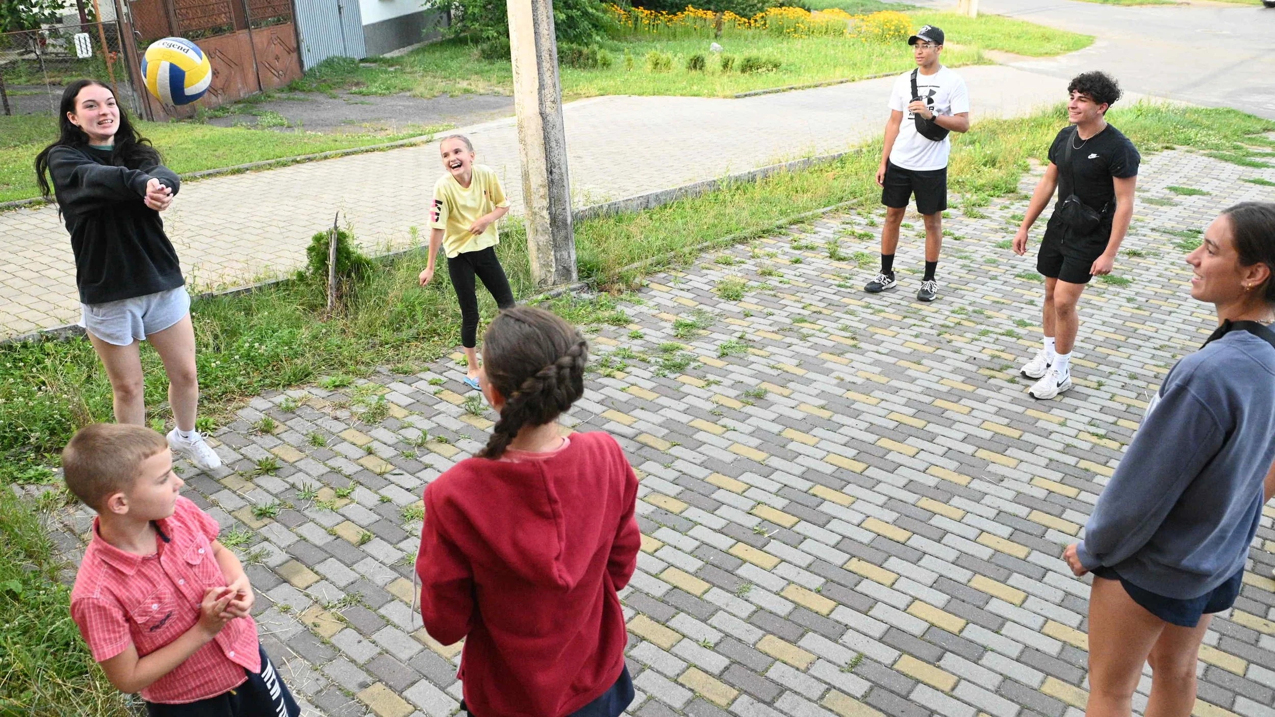 Madisson Garcia (top left) and three CCOB teens: Joseph Henry (top right), Riley Panariello (middle right), and Olivia Martin (front right) play volleyball with Ukrainian orphans. Madisson co-led the CCOB youth team while in Ukraine.