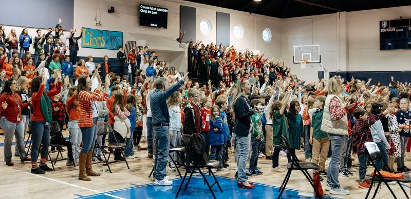 Children and teachers worship at a chapel service. Chapel is held weekly at CCA.