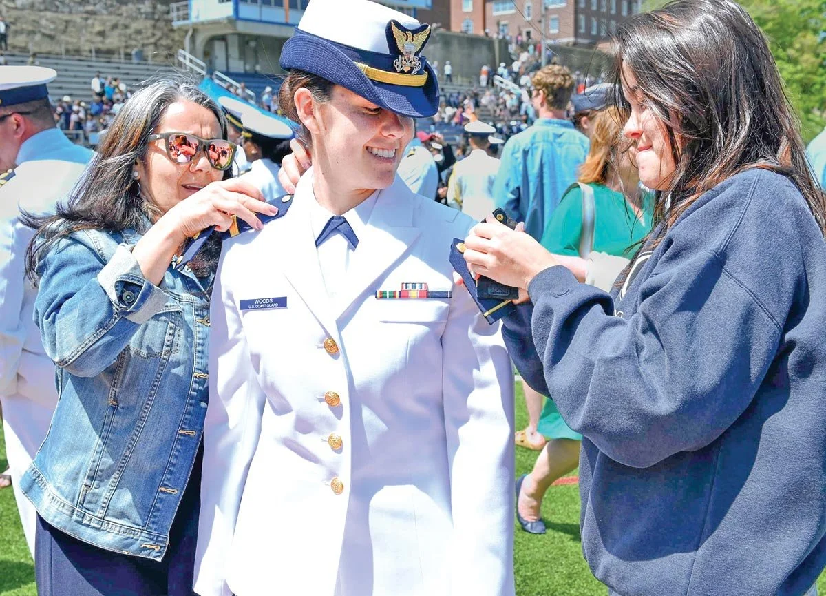 Proud mother, Ann Woods (left), and Kendal’s twin sister Krystle eagerly replace Kendal’s Academy Cadet shoulder boards with USCG Ensign shoulder boards.