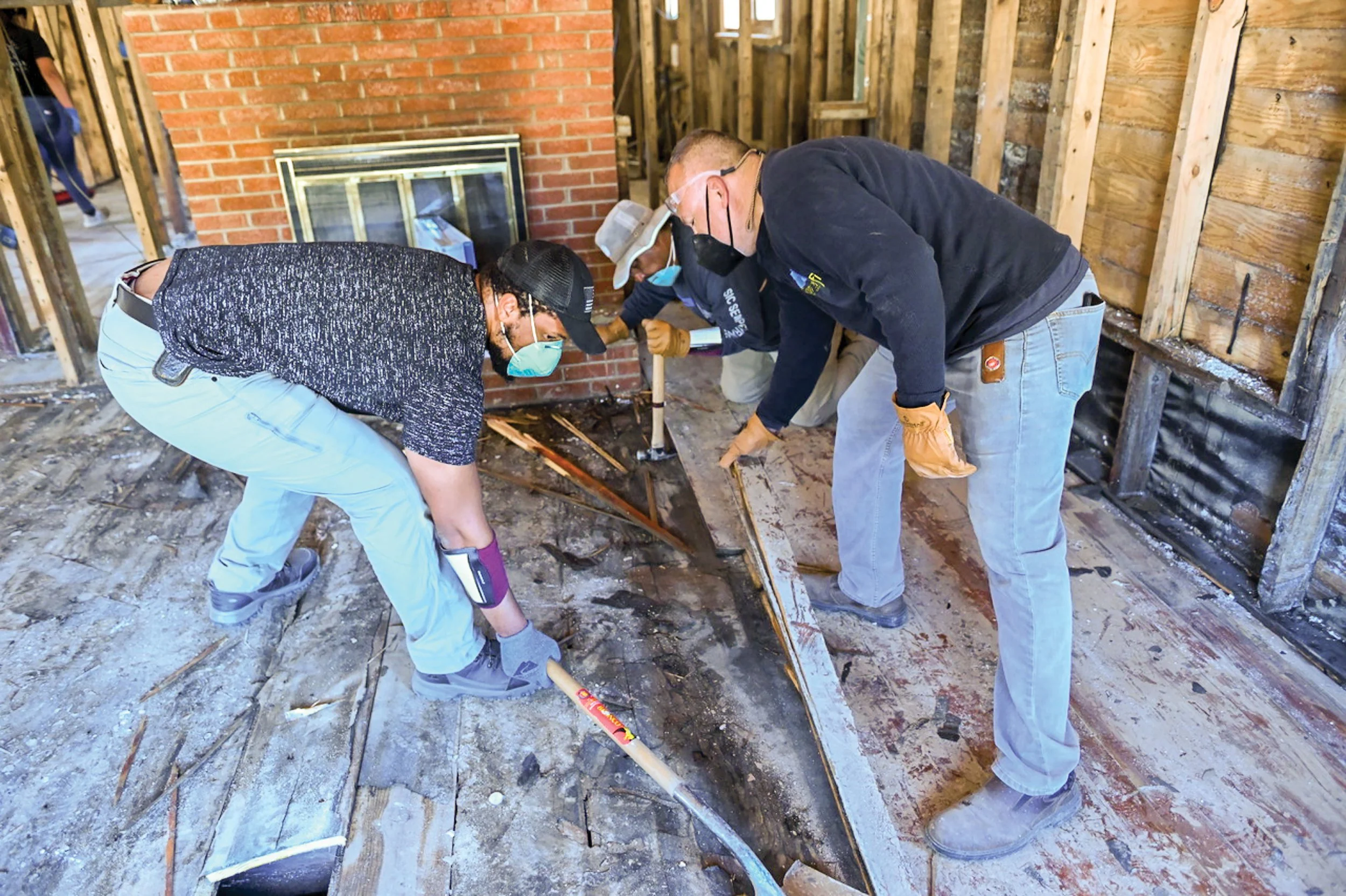 A 15-member team from CC Lockhart drove 23½ hours from Texas to work as volunteers. Belar Sneed (left), Thomas Trejo (center), and Pastor Pete Arcineaga (right) remove flooring in Asheville.