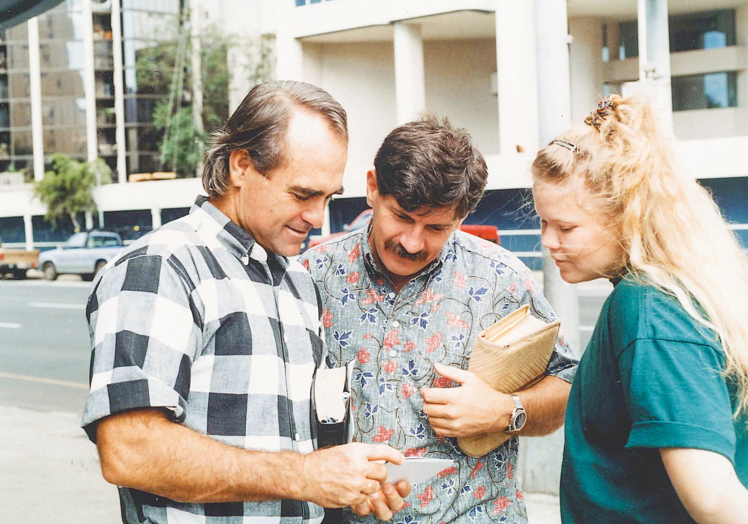 Kevin O’Neill and his daughter, Kara, join Pastor Bill Stonebraker (left) as they shared their faith on the streets of Honolulu many years ago. Kevin had been on the church board for many years and recently passed away. Kara currently teaches in the church’s school. Bill is the senior pastor of Calvary Chapel Honolulu, HI.