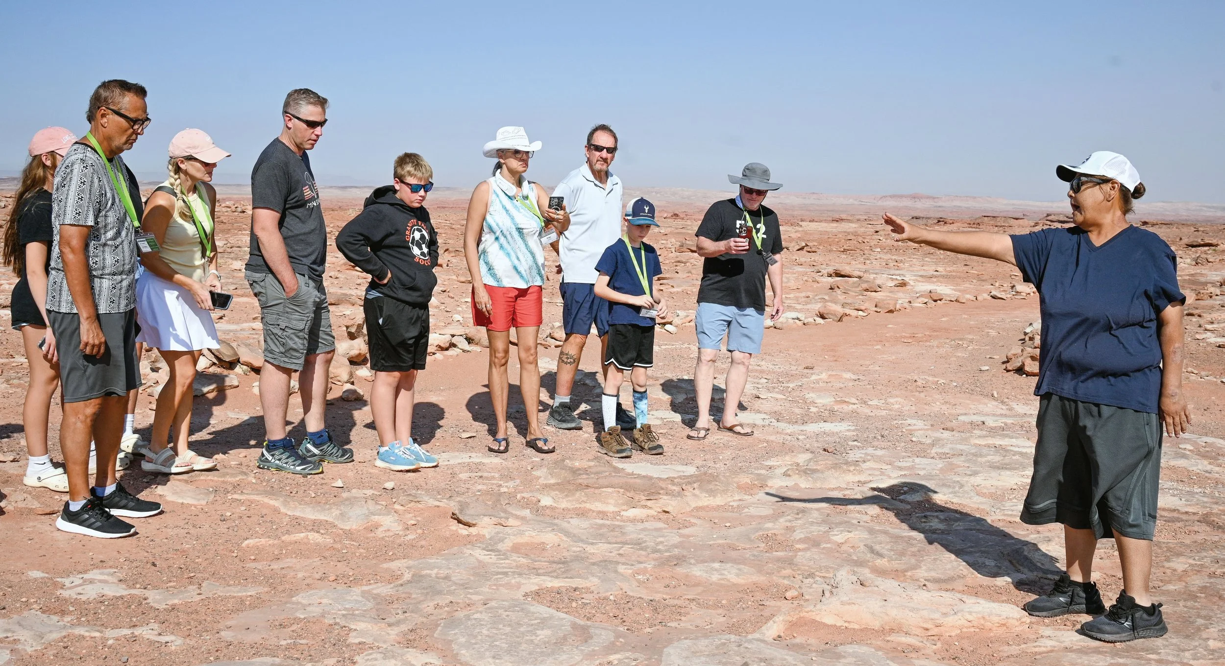 Pastor Mark Castillo (far left) of Calvary Chapel Renaissance CA, and others listen as a Navajo Native American shares her view on the dinosaur tracks.