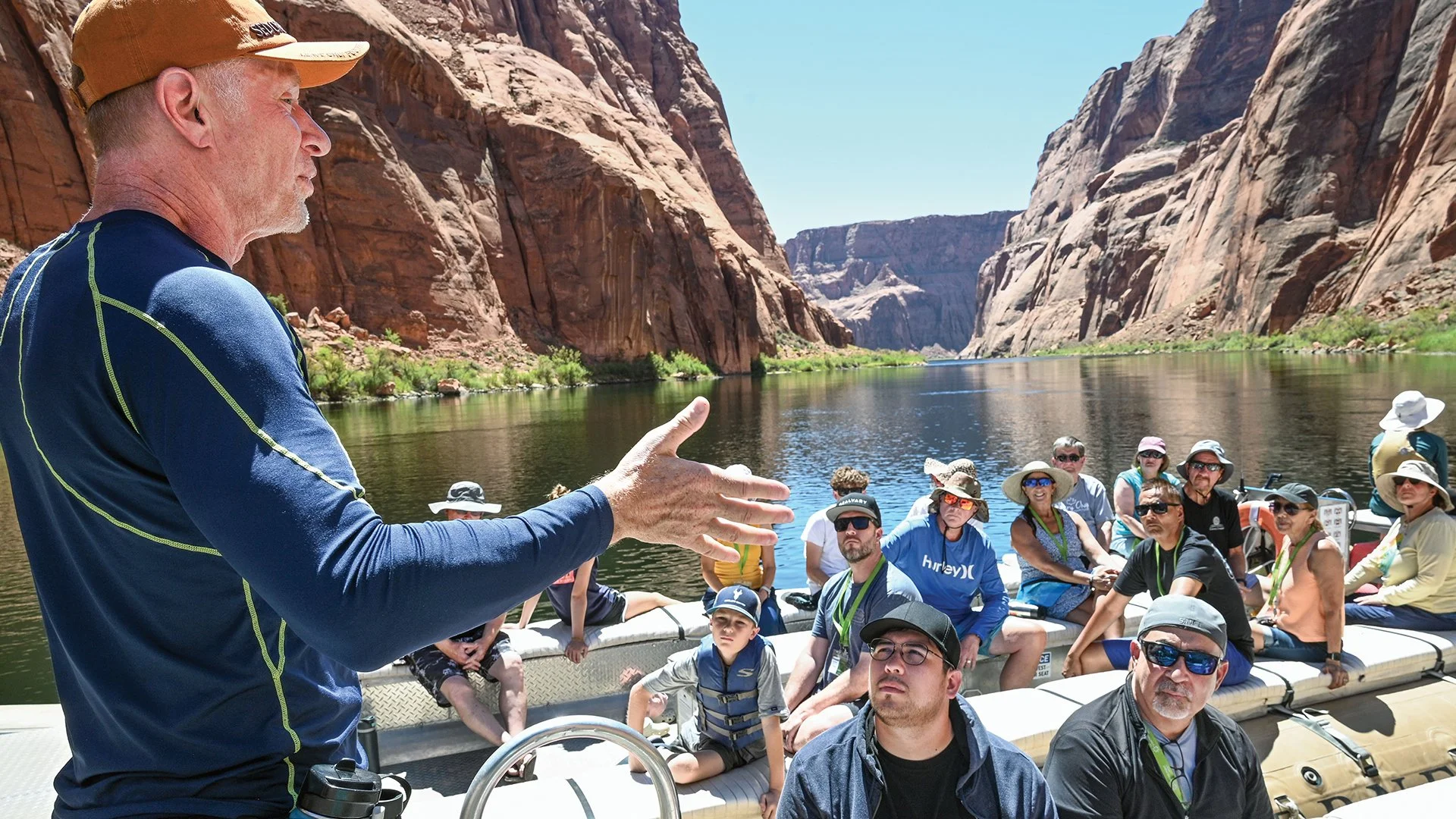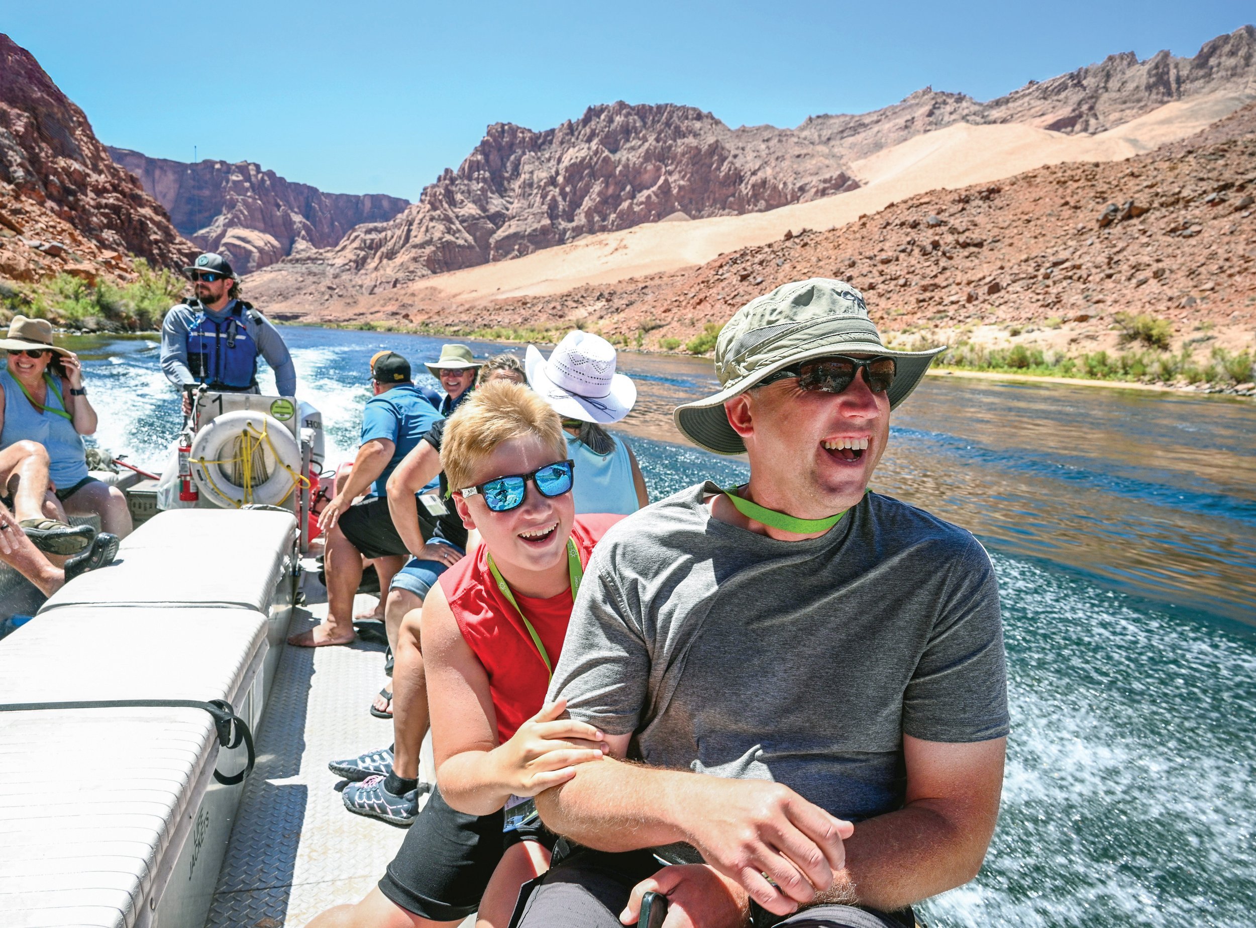 Shane Algard (right), pastor of Calvary Chapel Lake Stevens, WA, and his son, Aaron, enjoy the spray from the Colorado River as the boat driver navigates the water. The CC pastors learned how to better defend the Genesis creation account.