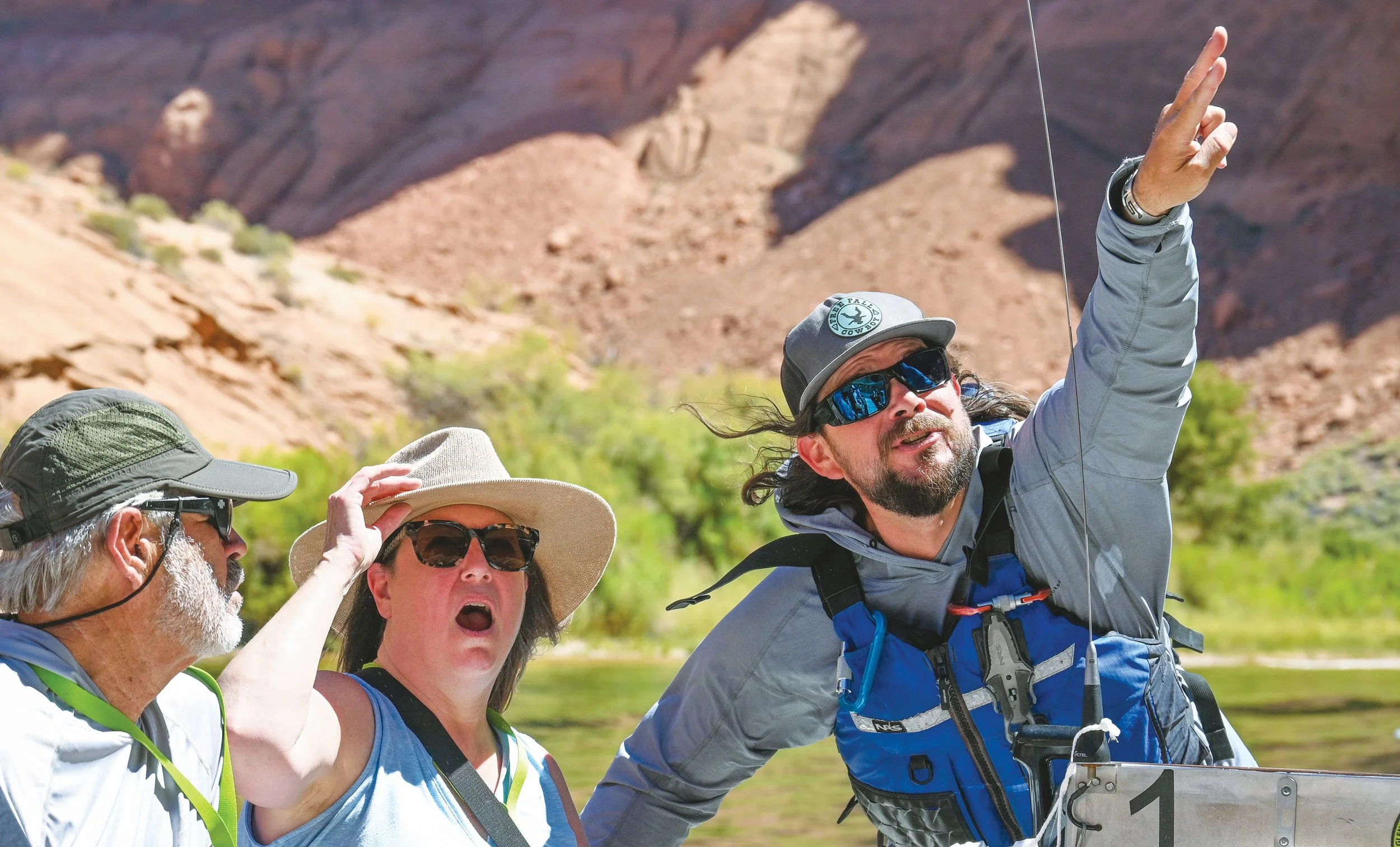 Debi Schneider (middle), wife of CC Santa Barbara, CA, Senior Pastor Tommy Schnieder, is awed by the rock formations pointed out by the raft guide, Castro.