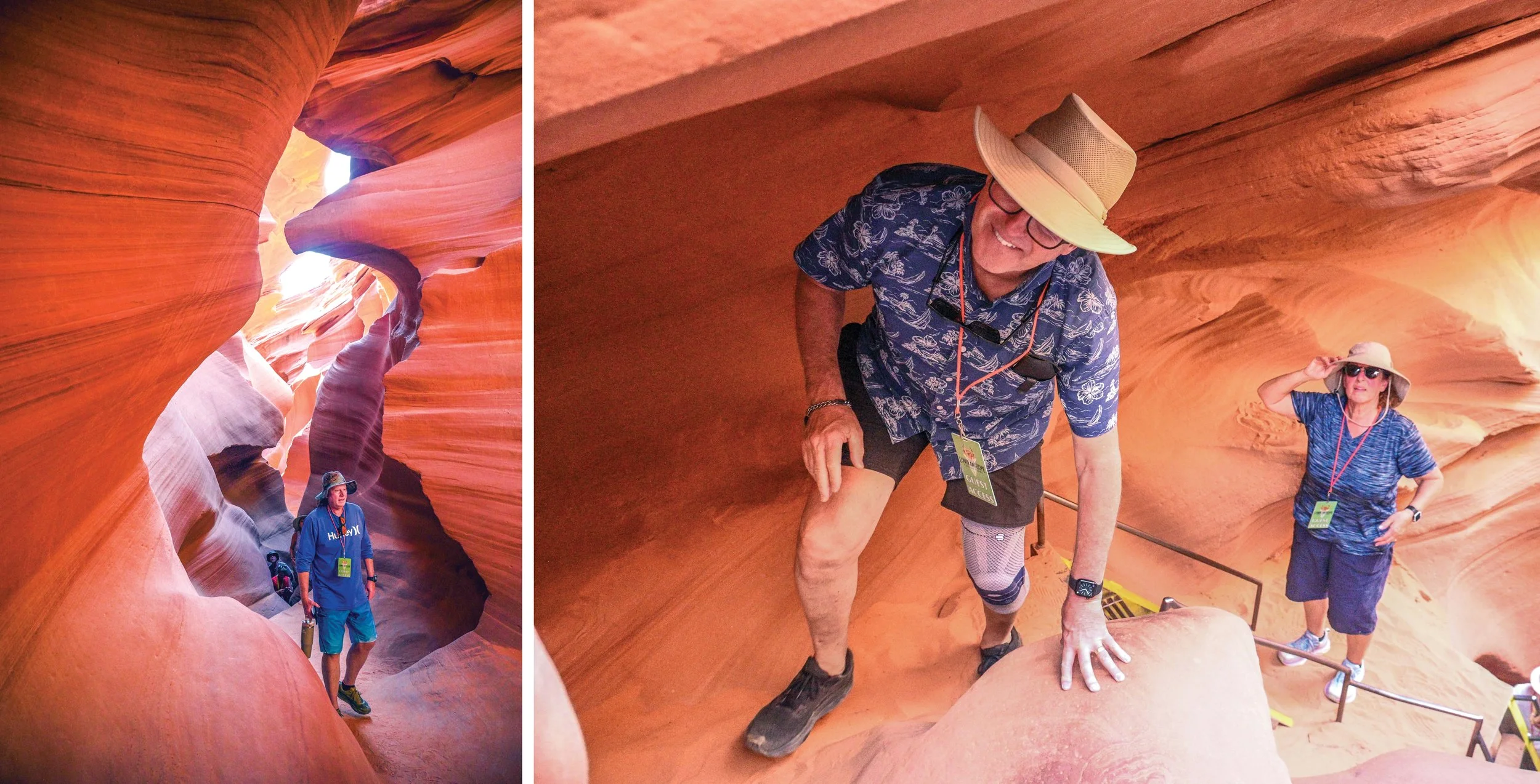 Right: Pastor Tommy maneuvers the tight turns in Antelope Canyon while Leisa Carter surveys what is ahead.