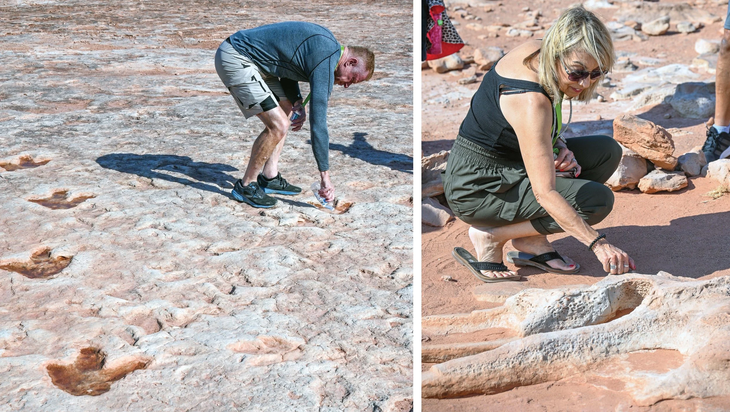 Left: Jay pours water in a dinosaur track for greater visibility. The tourist attraction, located on Navajo land, is rarely visited.