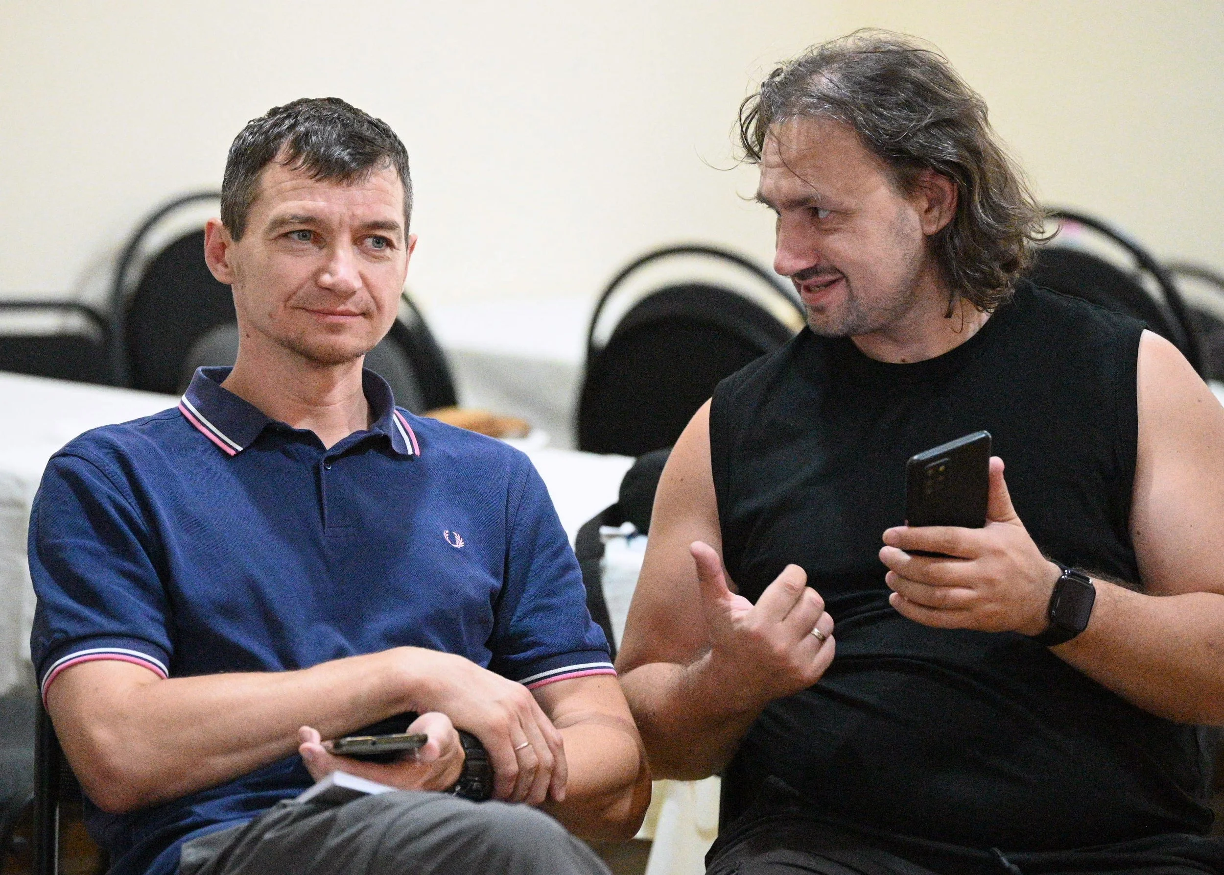 In August 2023, Vadym Kotelenets (left) and another fellow pastor relax together at a meeting at Calvary Chapel Ternopil in Ukraine. Photo by Tom Price