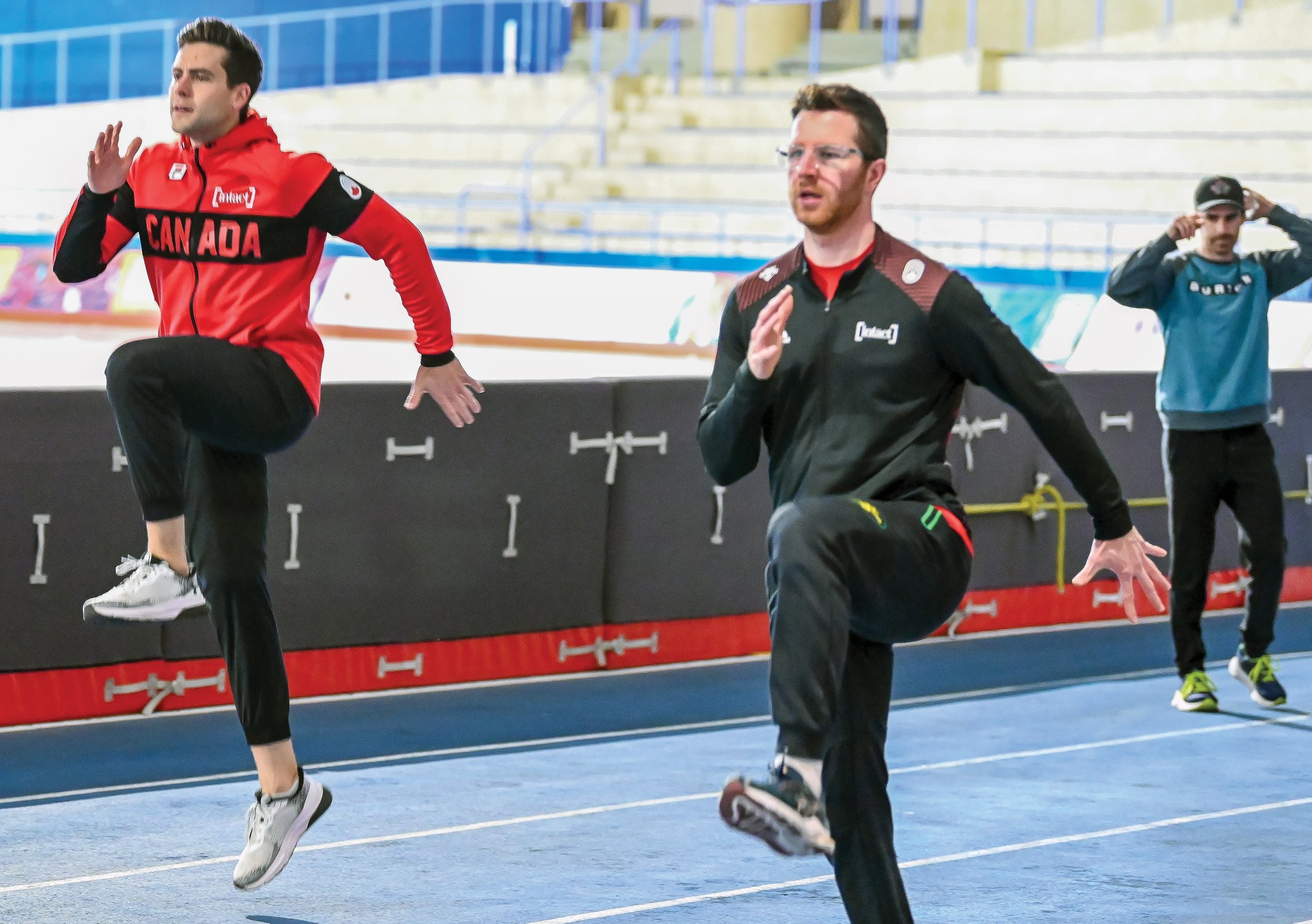 Anders (center) and two members of Canada’s long track National Team perform speed drills at Calgary’s Olympic Oval, the site of the 1988 Winter Olympics.