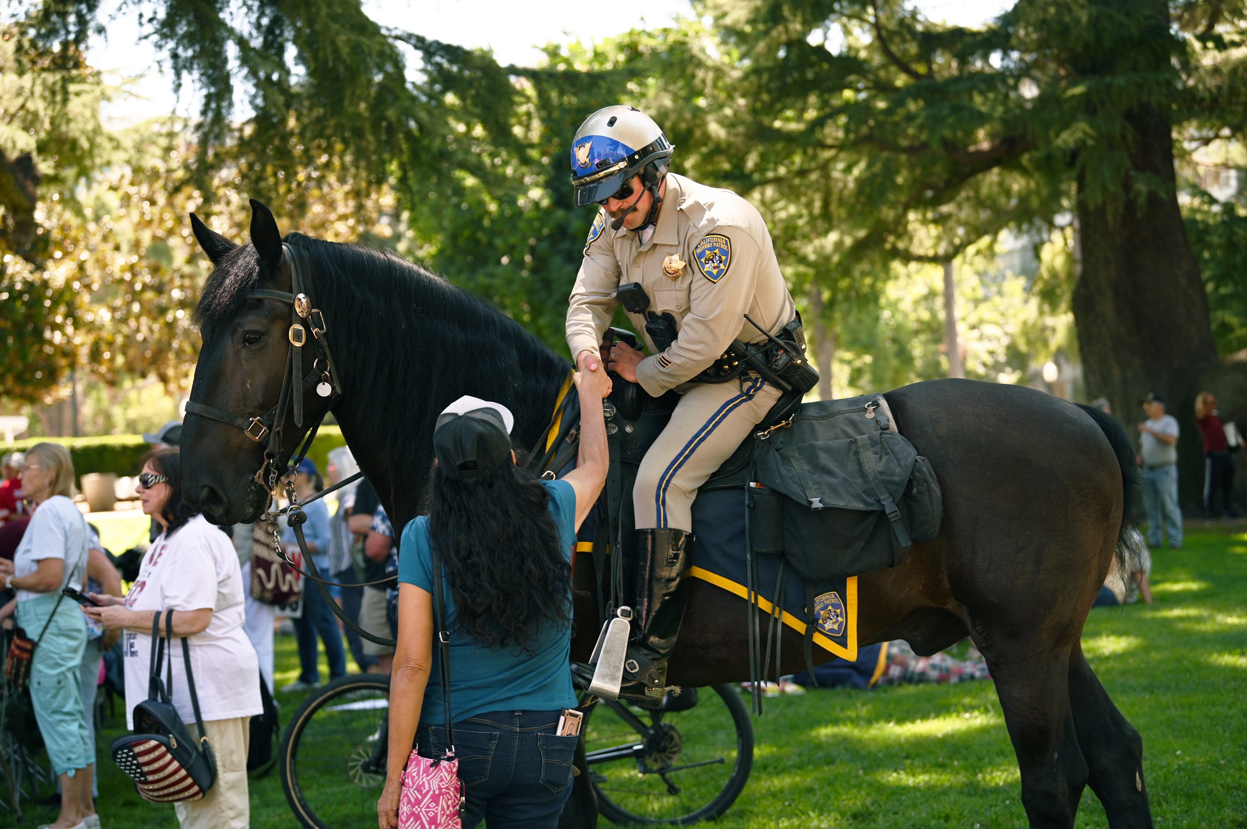A rally participant thanks a mounted police officer for his hard work protecting California citizens.