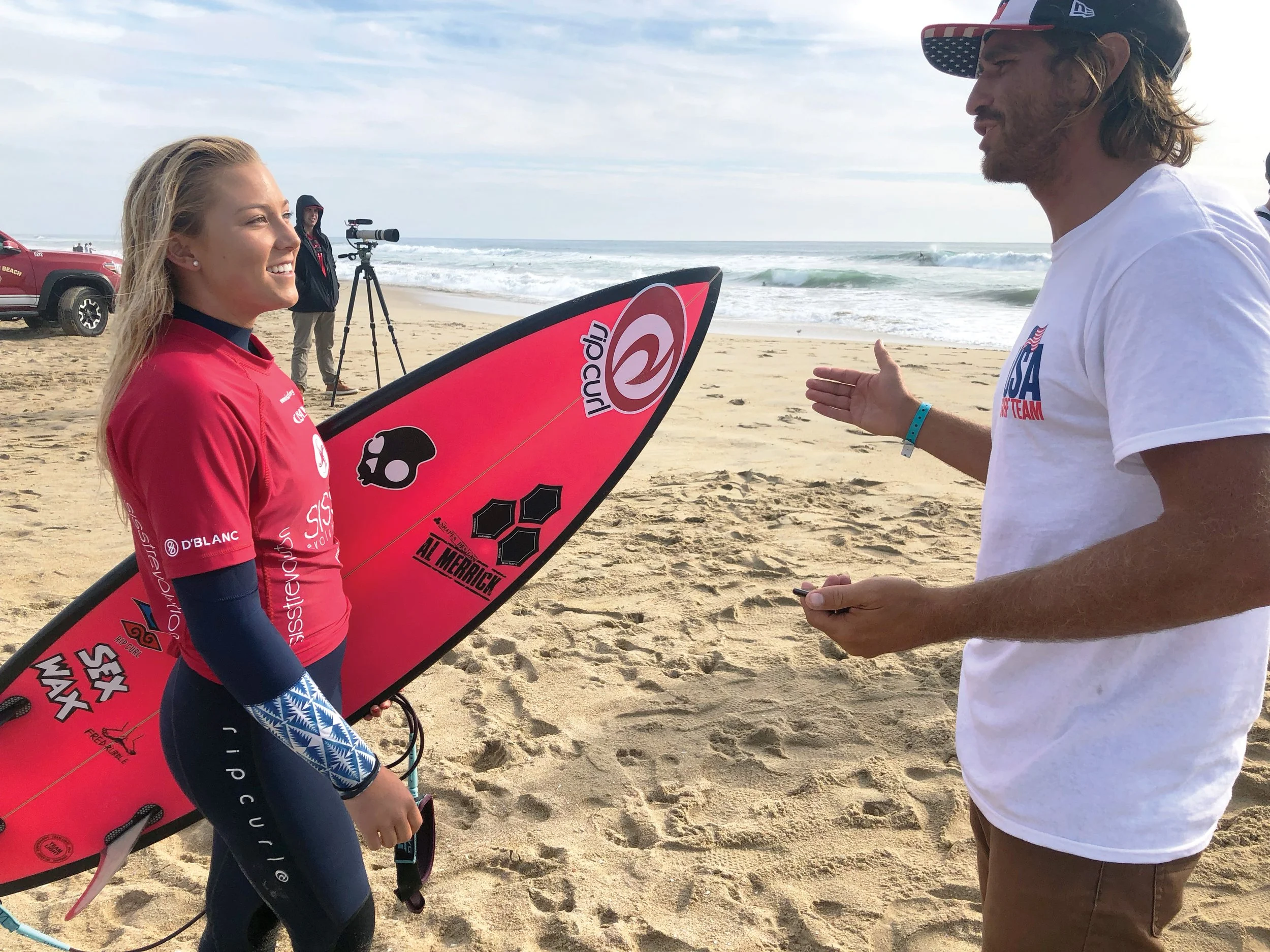 Brandon (right) discusses strategy with World Surf League’s 2024 world champion Caitlyn Simmers at the 2018 WJSC.