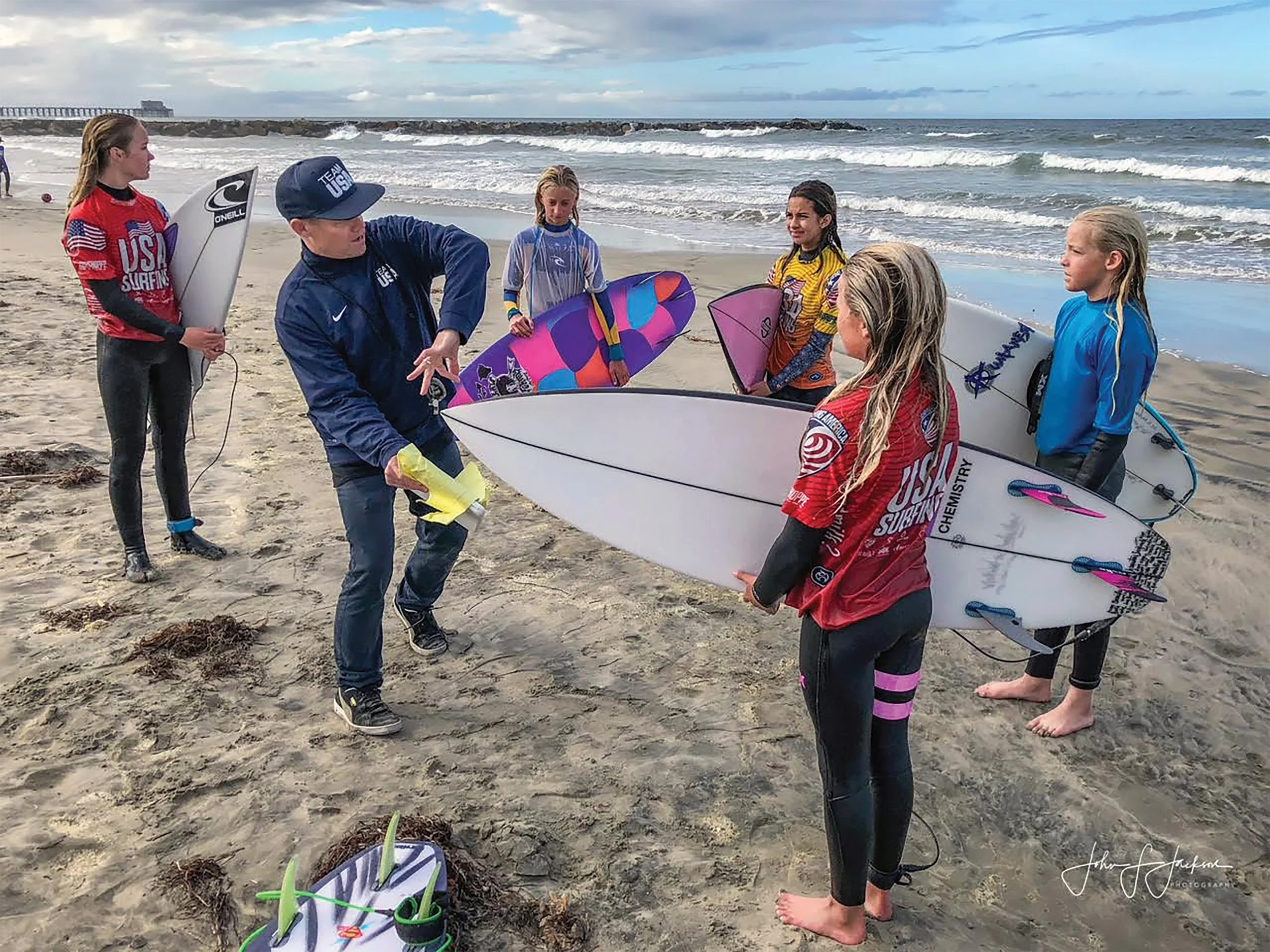 Joey (second from left) teaches technical elements of upper body surfing to aspiring young USA National Junior Team surfers in 2018.