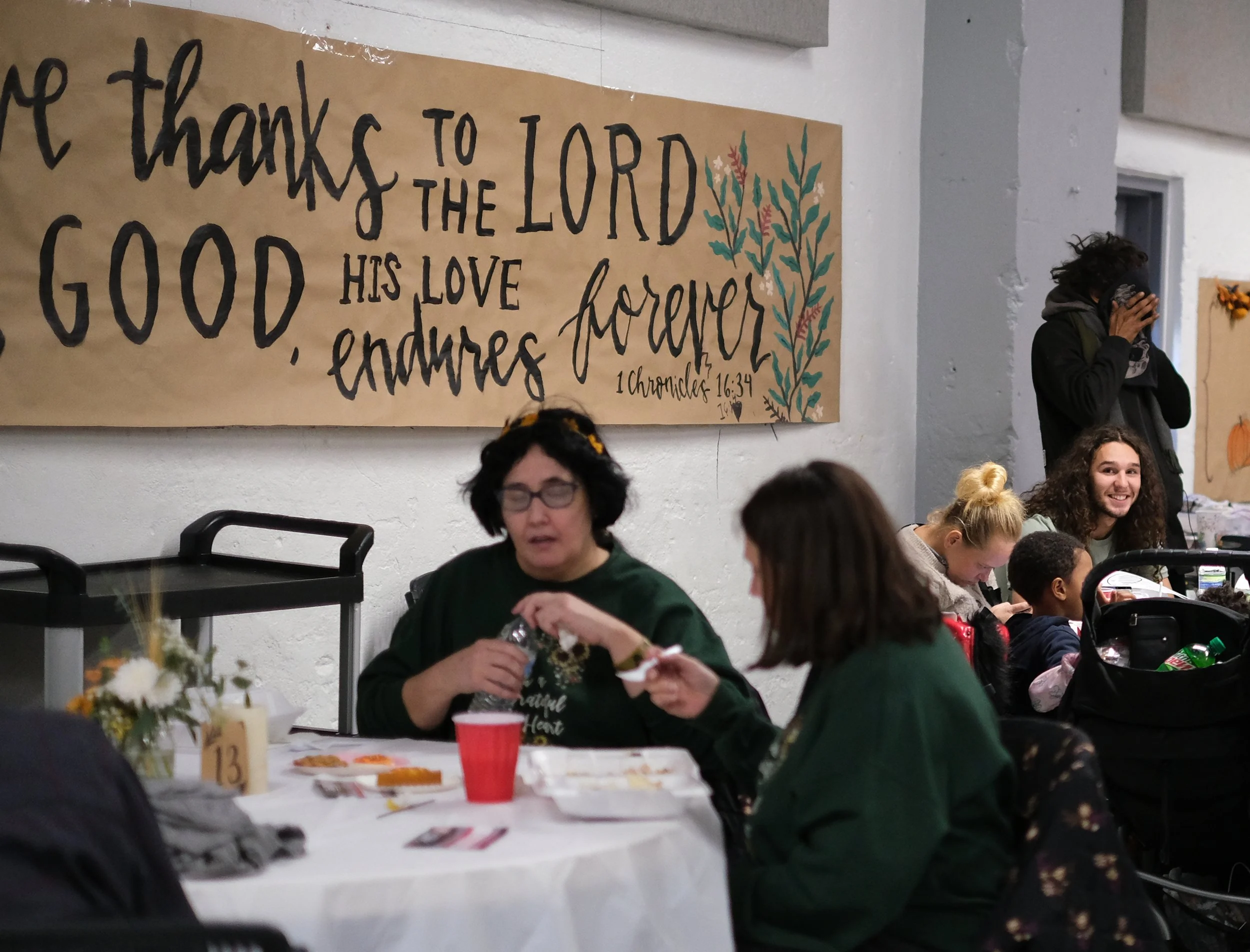 A volunteer from the church is assigned to each table where they connect with those seated, sharing in the conversation and explaining the Gospel message. For those seeking more one-on-one prayer, private rooms give believers an opportunity to minister to the person’s needs in a more secure setting. And many offered up their culinary skills, cooking 800 pounds of turkey that was served that day. Keeping things lively, Santos of Santos Ministries was on site singing Christian Doo-Wop songs throughout the event.