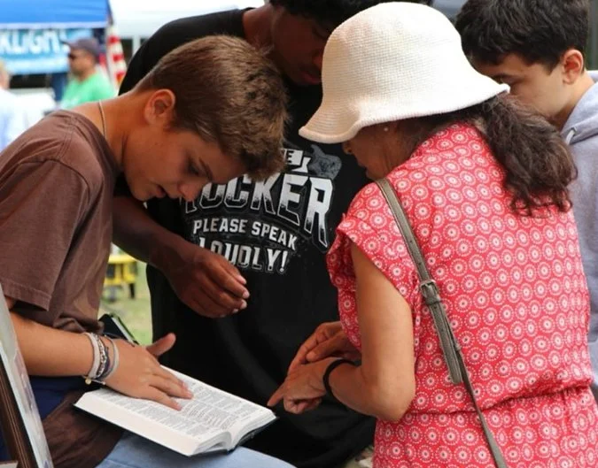 A youth immerses himself in God’s Word, with the encouragement of several people around him.