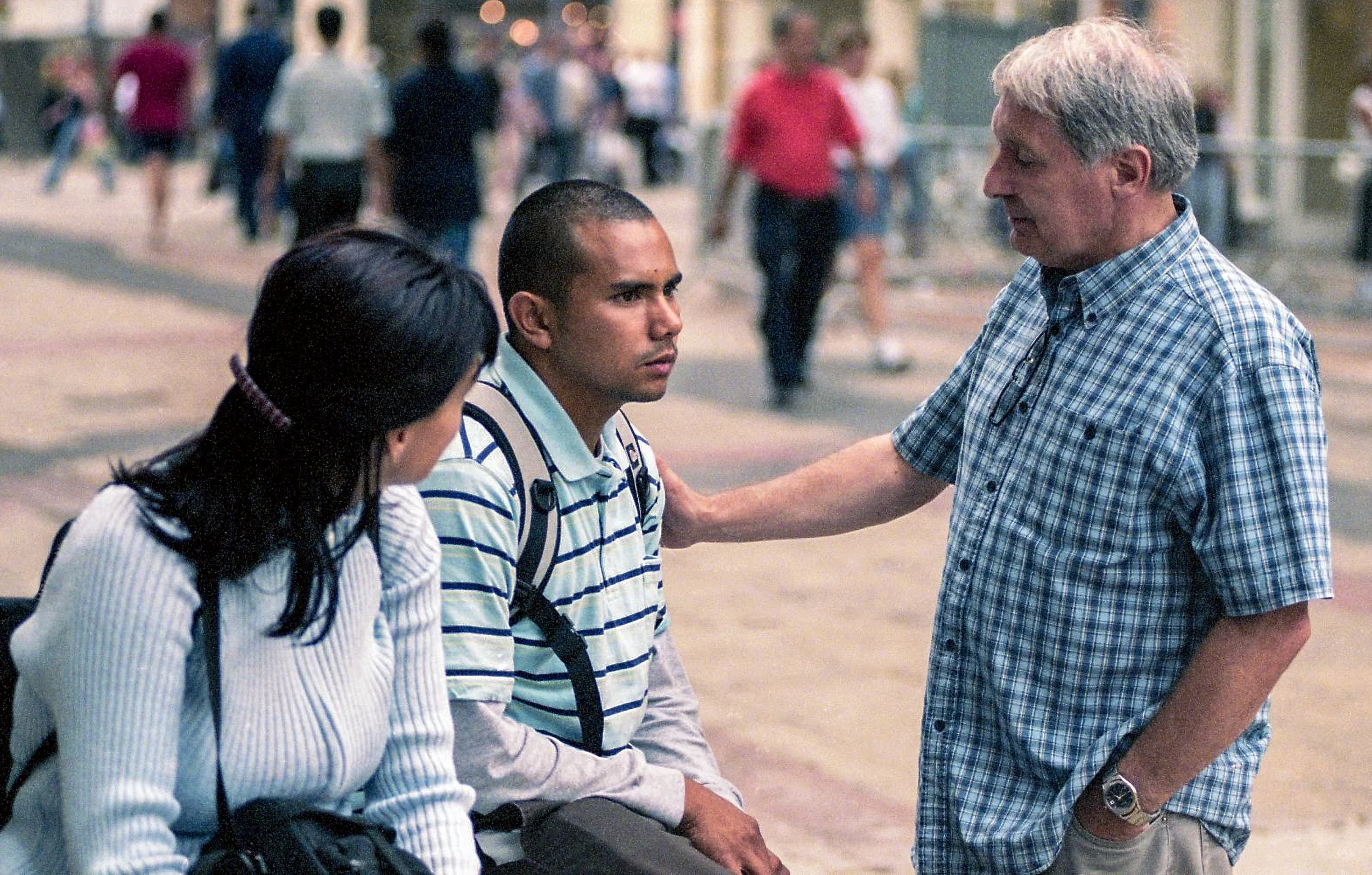 Center: John Milhouse shares Jesus Christ with a young lad.